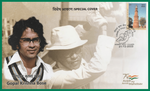 A Special Covers was released on Gopal Krishna Bose Cricketer at Kolkata on 22nd Dec 2022 . Gopal Bose (20 May 1947 -26 Aug 2018) was a cricketer from Bengal. He played one ODI for Ind vs England and was member of Indian team in the Unofficial Tests vs Sri Lanka partnering Sunil Gavaskar as an opener. He was also the Manager of India under 19 Virat Kohli led team which won the the U-19 World Cup.