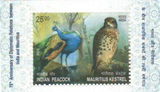 India Post issued a Rupees 25 Miniature Sheet to commemorate 75 Years Diplomatic Relations between two countries on 2nd November 2023. The stamp features Indian Peacock and Mauritius Kestrel.