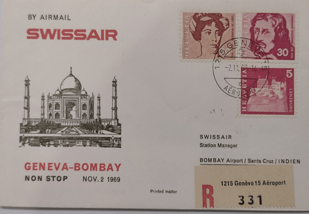 SWISSAIR operated Non-Stop flight from Geneva to Bombay (now Mumbai) on 02 Nov 1969. A First Flight cover was issued by SWISSAIR featuring Taj Mahal and cancellation of Geneva Airport.