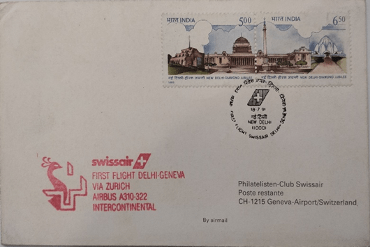 SWISSAIR operated a Flight from Delhi to Geneva via Zurich on 18 July 1991. It also released a First Flight cover to commemorate this event. The Cancellation was provided at Delhi and Se-Tenant stamps to commemorate 60th Anniversary of New Delhi . These stamps were issued by India Post on 25th June 1991 and feature Landmark Monuments and Heritage Buildings of New Delhi.