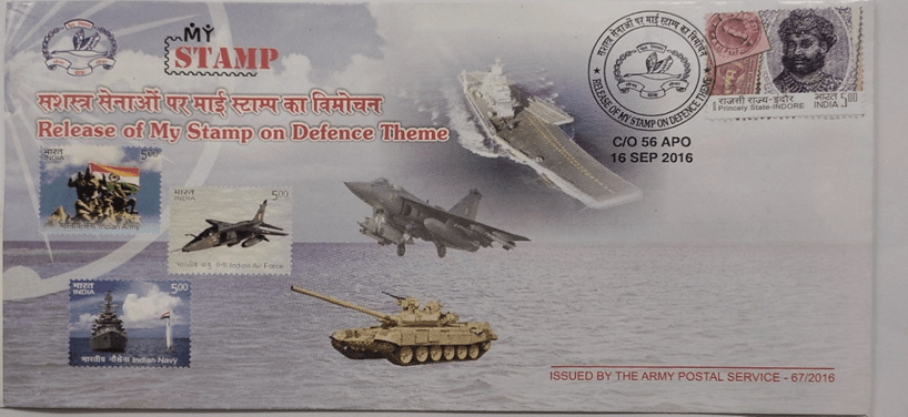MY STAMP is the brand name for personalised stamps issued by India Post. The First MY STAMP was issued during INDIPEX 2011- International Stamp exhibition. The First “MY STAMP” on Three Defence Themes Army, Air Force & Navy was released on 10 Jun 2016.